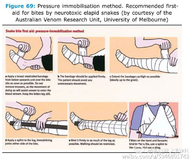 如果咬人的毒蛇是眼镜蛇类的毒蛇,它们的蛇毒是神经毒素,有迅速导致呼吸麻痹、窒息死亡的危险。这时候可以采用缠绷带固定的方法来延缓蛇毒的扩散,具体的做法是用绷带把受伤的那条腿从脚趾头到大腿根一圈圈缠绑,紧贴脚放一根夹板,再缠绑一遍。如果是手被咬到,与此类似。