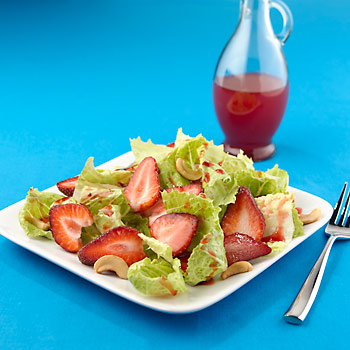 2碗长叶莴苣和0.5杯草莓切片放在一起,再添加1.5勺覆盆子果酱搅拌均匀,最后撒上1勺腰果就可以享用了。你可以把它作为一份零食或一道配菜,甚至一顿简单的主食。