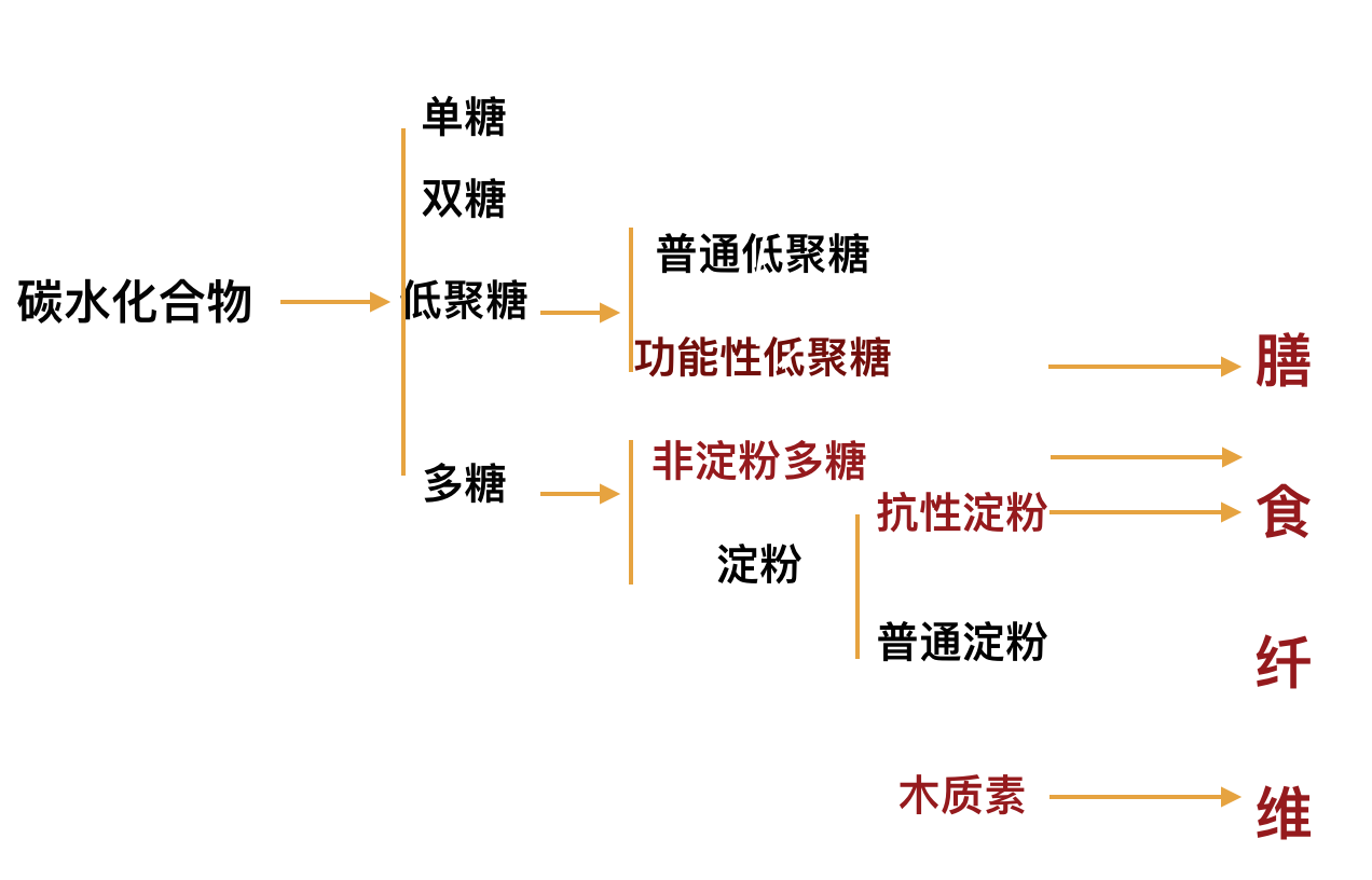 膳食纤维属于碳水化合物中的一大类(木质素除外),而碳水化合物是三大养分(蛋白质、碳水化合物和脂肪)之一。碳水化合物可以有不同的分类方式。英国著名营养学家Catherine Geissler在其著作《人类营养学》(Human nutrition)中将碳水化合物分为三类:1. 糖(单糖和二糖);2. 寡糖(含3~9个糖单位);3. 多糖(大于9个糖单位),而多糖又可以分为淀粉和非淀粉多糖。
