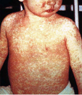在初始的类似流感的症状之后,患儿皮肤上开始出现红色的斑丘疹。出疹的位置非常规律,从耳朵后面开始,延伸到脸上,然后遍及全身,患儿的最大风险也出现在这一时期。当皮疹蔓延到四肢,直至手心和脚心时为“出透”,预示着患儿已通过考验。