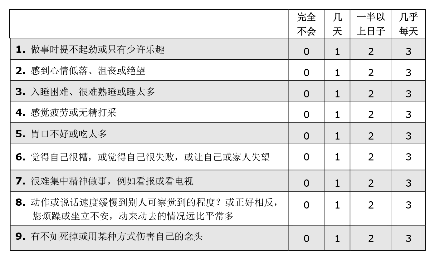 PHQ-9量表严格符合DSM-5的9条症状学标准,每个条目0-3分,总分值范围为0-27分。PHQ-9既可以用于筛查也可用于评估抑郁严重程度,采用该量表对患者进行评估,既可提供量化指标,也可帮助医生制定临床决策。PHQ-9量表是被DSM-5推荐使用评估抑郁严重程度的量表。