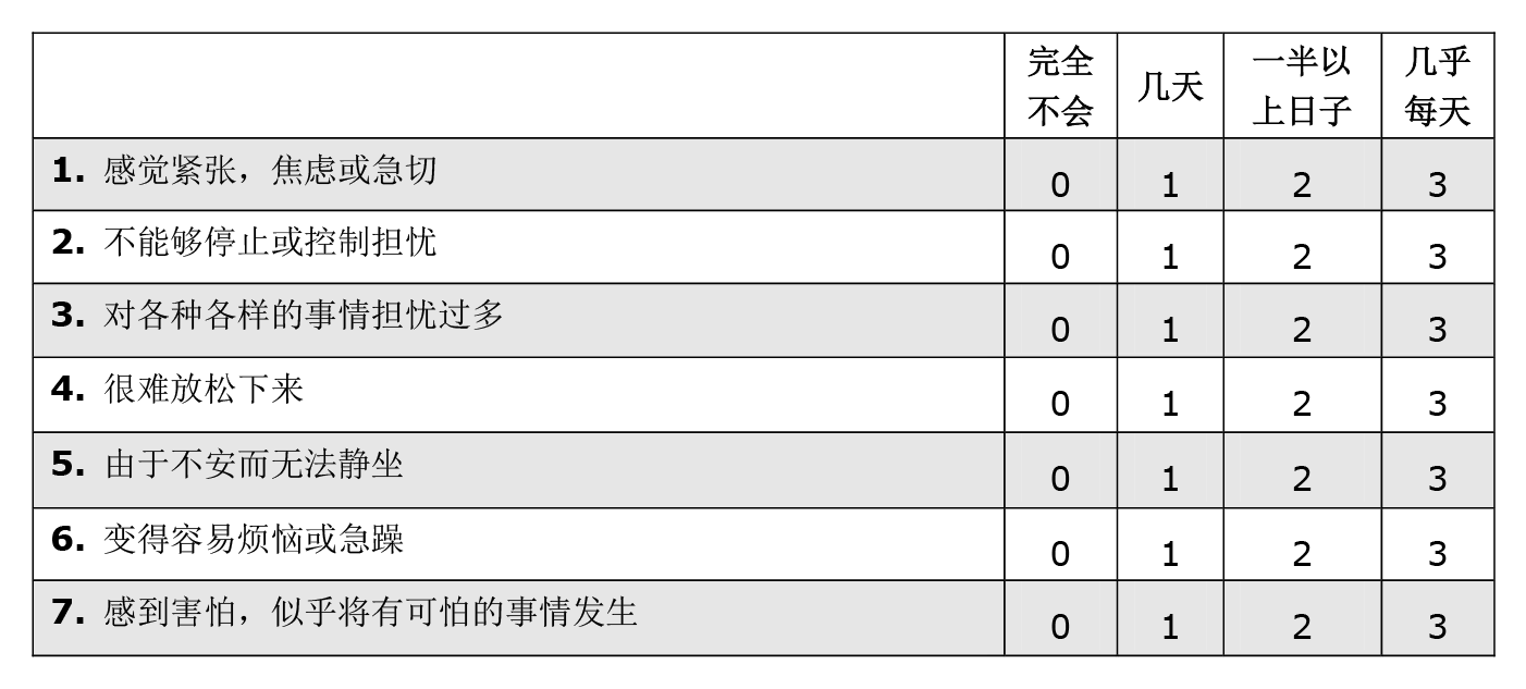 GAD-7量表是一种简便有效的广泛性焦虑障碍(GAD)识别及评估工具,在国外已被广泛应用。该量表共有7个条目,每个条目0-3分,总分值范围0~21分。GAD-7量表在临床实践中可以有效筛查GAD并评估其严重程度,在中国人群中的研究显示,GAD-7量表具有良好的可信度,对广泛性焦虑障碍及惊恐障碍的筛查具有较高的敏感度和特异度。