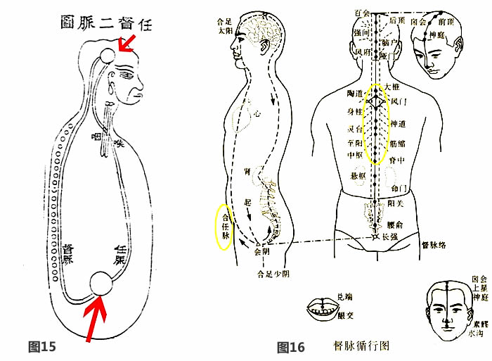 古人画的任督二脉线路太“完美”了。二者皆出于会阴,督脉沿后正中线(脊柱正中)笔直向上,过颅顶向前沿前额正中,鼻柱正中,至上唇系带处而止;而任脉则从前正中线笔直向上,经咽喉,至下颌,环绕口唇,沿面颊,分行至目眶下。二者注定要会师似的(图15 图16)。