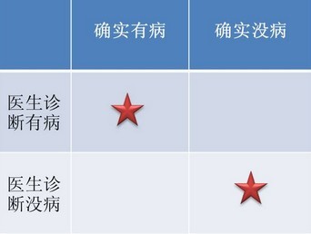 假如门诊里面有病和没病的比例和胎儿性别一样,一半一半,那么猜中的比例就像朝这个靶子乱投一样,投中两个红星框内的几率是百分之五十。也就是说,如果一个医生看的病人里面有病和没病的各占一半,那么他的误诊率如果是百分之五十,那医生的水平和瞎猜差不多,无疑是庸医。但实际上,有病和没病的比例并不是一半一半,甚至很多时候是差别很大。也许100个人里,确实有病的只有10个,其他90个都是没病的。这种比例前提下,还是向上面那个靶子投飞镖,如果依然是50%的投中率,需要把飞镖更多的投到右边“确实没病”一列里,这就需要一定的瞄准了。有病和没病相差越大,需要的瞄准水平越高。
