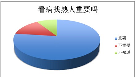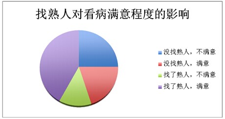 从第一个调查结果来看,绝大多数的人认为看病应该找熟人。对第二个调查结果需要做一下统计,比如卡方检验。检验结果认为没有统计学差异。也就是说,虽然大家都认为到医院看病找熟人很重要,但找不找熟人,对看病满意度并没有明显影响。当然,这个调查结果非常粗糙,还很难发表在正规的专业期刊上,但似乎也说明了一些问题。至少,和很多医生和护士的经验是相吻合的。大多数人看病只是个人的经验,而医生护士因为职业的关系,观察和体会肯定应该比普通人全面的多。而且对于看病找熟人这种事情,医生和护士的体会甚至和病人是相反的。换句话说,看病找熟人不仅没有好处,还可能是有害的,很多人反而找了熟人之后更加不满意。