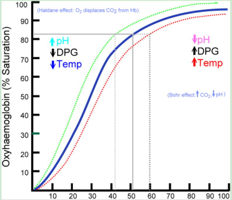 小学生理学都学过,呼吸的主要功能是吸入氧气和呼出二氧化碳。身体的所有组织保持正常活动都需要源源不断的氧气,缺氧会导致功能障碍乃至细胞和组织坏死,严重者会致残甚至死亡。血液从肺部流过的时候,就把吸入的氧气带到全身各处,这些富含氧的血就是动脉血。因此检查动脉中的氧分压,就是判断呼吸功能是否够用的合理指标。但为何要定在60mmHg呢?这要从病理生理学上一条著名的氧离曲线说起(见下图)。