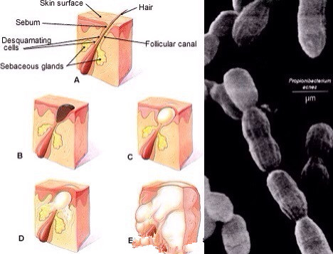1.皮脂中的游离脂肪酸及一些增多的炎性因子(主要是IgF-1)直接刺激毛囊皮脂导管引起炎症反应、角质增生。