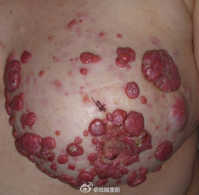 临床医生要注意的是胸部的瘢痕疙瘩有时难还以与一种称为铠甲状癌carcinoma en cuirasse的乳腺转移恶性肿瘤分辨,需要进行病理鉴别。