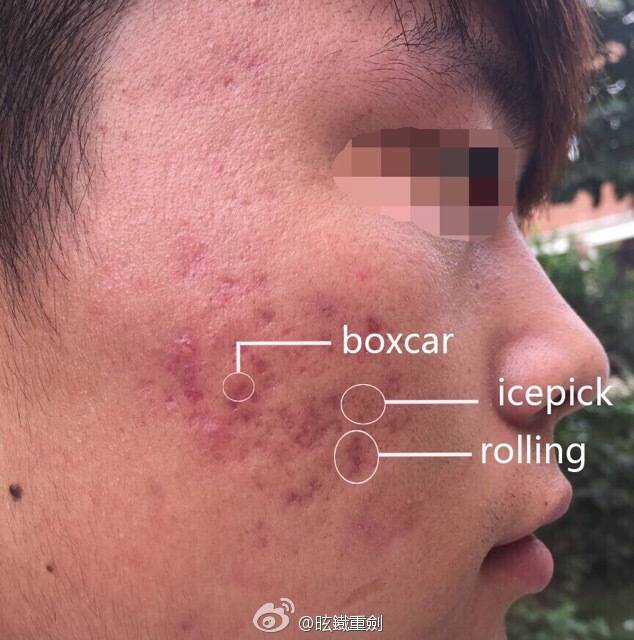 萎缩性疤痕在面部最多见,大部分是痤疮的后遗症,从形态上可分为冰锥型(icepick)、滚轮型(rolling)和箱车型(boxcar)三类。