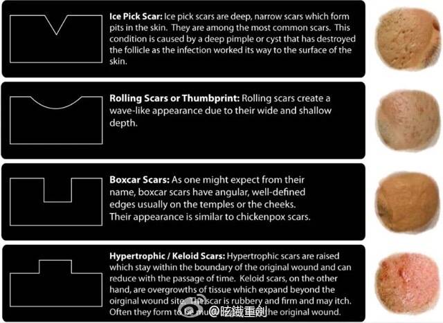 冰锥型就是象给冰锥扎过的一样,开口直径较小,边缘陡峭,它可以持续不变也可以发展为滚轮型或箱车型。箱车型就是象给货柜箱轧过的一样,开口较宽,表面常呈长方形,边缘陡峭锐利,变化较少。滚轮型就是象给轮子轧过的一样,边缘有缓和的坡度,是由于底部的真皮或皮下纤维牵拉形成的。