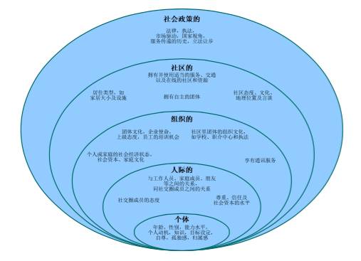 依据这个社会融合的定义,Simplican及Leader等人还给出了一个社会融合的生态路线,如图3所示。社会融合两大领域的相互作用会在社会的不同层面延伸,包括个人层面、人际层面、组织层面、社区层面以及社会政策层面。组织、家庭及整个社会可依据其所处于的位置为社会融合提供不同层面的考虑。