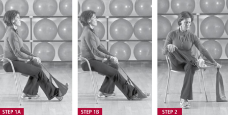 - 把右脚踝放在左膝上面,环绕带从右脚趾正下方转到脚背上,用左手保持其紧绷。慢慢将脚尖勾向右胫骨(3秒),暂停(1秒)后慢慢还原(3秒)。共做10次。