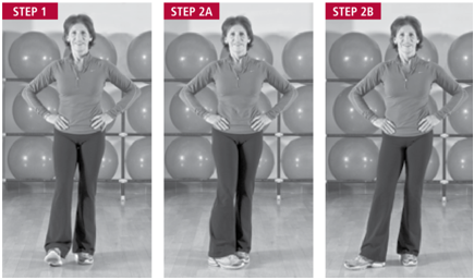 起始位置:笔直站立,双手虎口扠于髋部,双脚分立与髋部同宽。