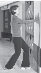 动作:双手放在墙上,向后伸直右腿,向地面按压脚后跟;同时微微弯曲左膝,并保持脚后跟着地。现在尽可能弯曲右膝,脚后跟不要离地,感到右小腿伸直。保持10~30秒后还原。然后换左脚重复,即为完成一组。