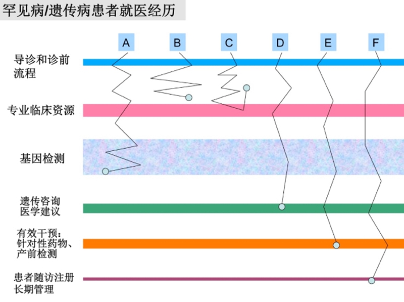 这是我画的一个模式图,我在很多场合也展示过,比较全面地反映了患者的医疗路径。ABCDEF,相当于六种情况。首先患者要获得一个正确的导诊,他需要找到该找的医生,专业医生,因为罕见病的医生比罕见病患者更罕见。