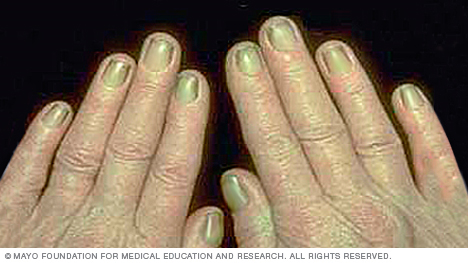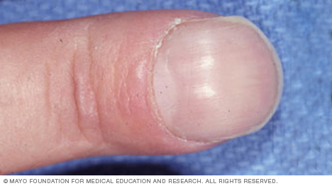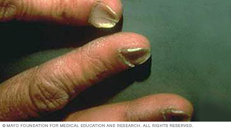 指尖增大、指甲弯曲的杵状指出现通常要经过多年时间。杵状甲有时是血液中含氧量低导致的,这可能是各种肺部疾病的征兆。杵状甲还与炎症性肠病、心血管疾病、肝病和艾滋病有关。