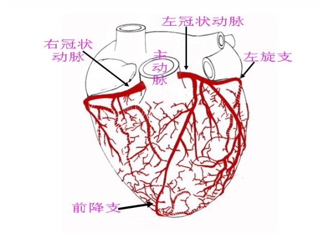 心脏本身供应的血液是由主动脉起始部位发出的两个分支(近水楼台先得月)叫做“冠状动脉”的血管完成的。一支叫“右冠状动脉”,一支叫“左冠状动脉”。左冠状动脉分为两个主要分支,一个叫“左旋支”,一个叫“前降支”,再从这几个主支分出细小分支,覆盖全部心脏。看上去象个“帽子”戴在心脏的头上一样,所以得名为“冠状动脉”。