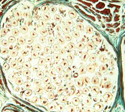 神经是有神经细胞组成的。神经细胞表面有许多短的接受信号的突起及一根长长的送出信号的神经纤维,称为“轴突”。 神经纤维信号的传导是一种“电信号”,如同电线传导一样。为了不使电信号发生“漏电”、“串线”,在每根神经纤维中央细丝周围包绕着一层厚厚的保护膜,称为“髓鞘”(图2)。
